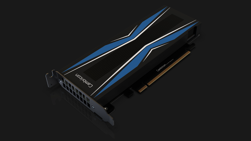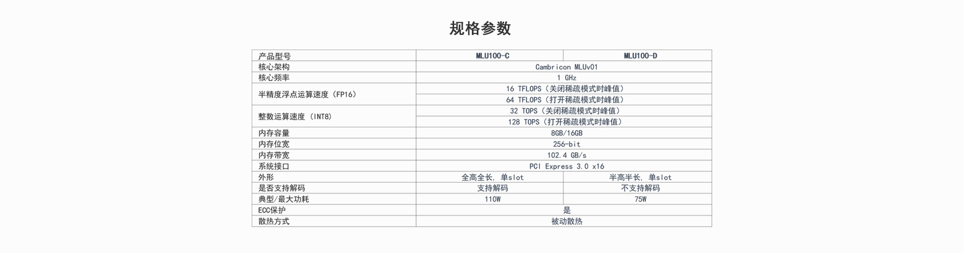 MLU100云端智能芯片的等效理论计算能力高达128TOPS, 支持4通道64bit ECC DDR4内存,并支持多种容量,可满足各类推 理场景的计算和存储需求。